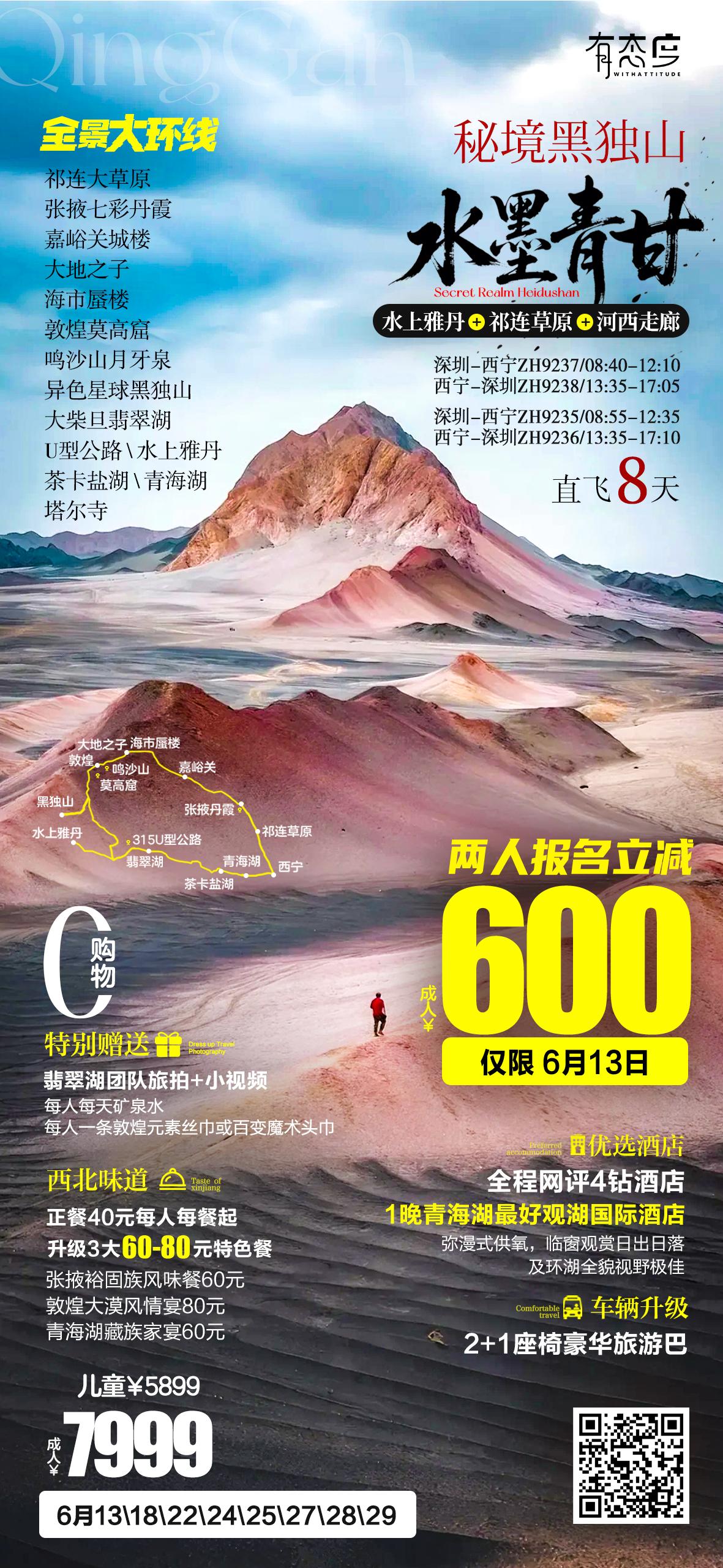 【水墨青甘·秘境黑獨(dú)山·全景大環(huán)線】-【直飛西寧+純玩0購物】-【7晚4鉆含1晚青海湖最好觀湖國際酒店湖景房彌漫式供氧】-【2+1座旅游巴+風(fēng)味餐60-80元】-【翡翠湖旅拍】